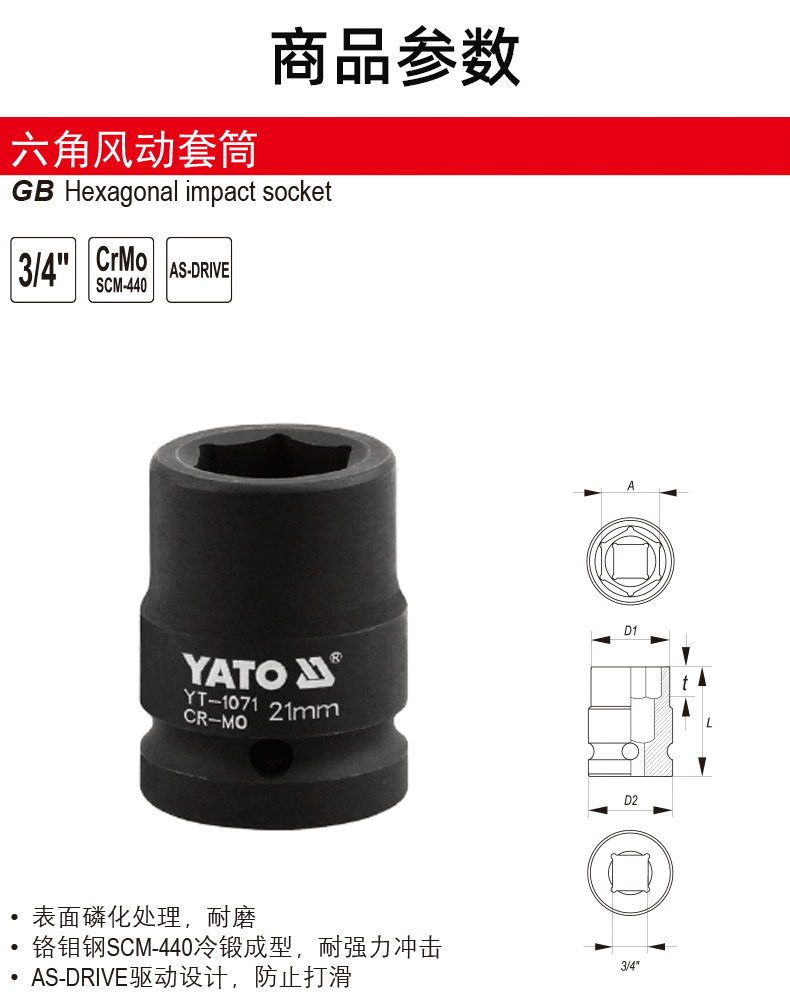 易尔拓/YATO YT-1086 . 3/4"六角风动套筒36MM 1/个