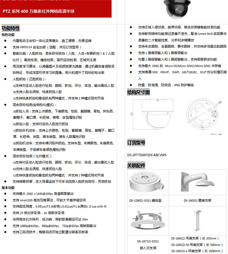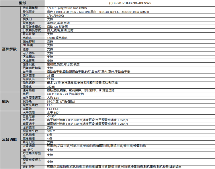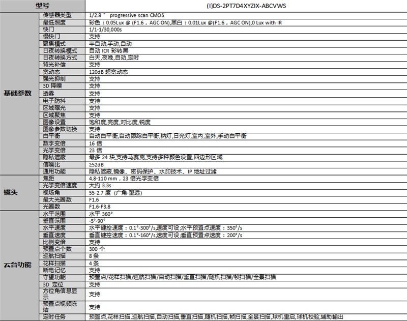 海康威视 (I)DS-2PT7D4XYZIX-ABC/VWS PTZ智能球型摄像机 400万网络高清摄像机 白色(单位:台)